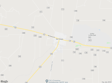 Landmarks: San Diego TX Fire Department, Duval County - San Diego Public Library, San Diego City Hall and Police Department, San Diego Muni Utility District 1, Community Action, Duval County Museum, Archie Parr Elementary School, Security Finance, Bedazzle & More Flower Shop, Valley Transit Co, Vaquero Car Wash, United States Postal Service, Duval County Precinct 2 Shop, Citgo, Justin's Hall, Kwik Pantry, Greyhound: Bus Stop, San Diego Food Market, Civil Defense Office, Duval County Sheriff's Office