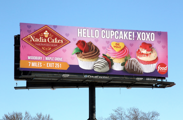 Utilizing classic Valentine’s Day motifs is a great way to advertise your bakery. In this billboard advertisement for Nadia Cakes, they use classic colors such as reds, pinks, and purples to catch the attention of passersby. This, paired with delicious romantic desserts—like candy hearts, chocolate covered strawberries, and cupcakes adorned with roses—makes this OOH ad too sweet to pass up!