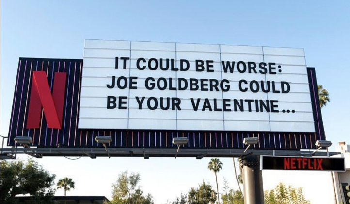 Netflix is one of the most prevalent streaming platforms across the globe, which means that they can be extremely creative with their out-of-home advertisement. This Valentine’s ad includes Netflix’s iconic logo, and makes reference to the Netflix original series You, in which the obsessive and stalker-y Joe Goldberg inserts himself into the lives of various young women. By making a joke and a reference to one of their popular series, Netflix uses Valentine’s Day ads to engage with those who know their content and intrigue those who do not.